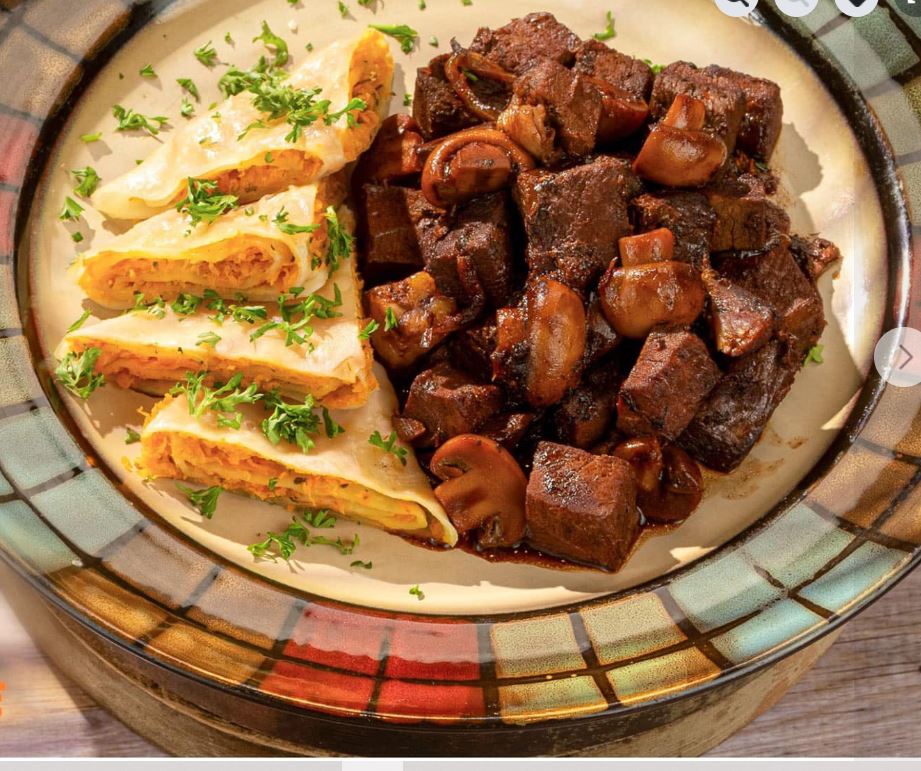 Salad with tender beef cooked with onions and carrots in a rich and savory sauce